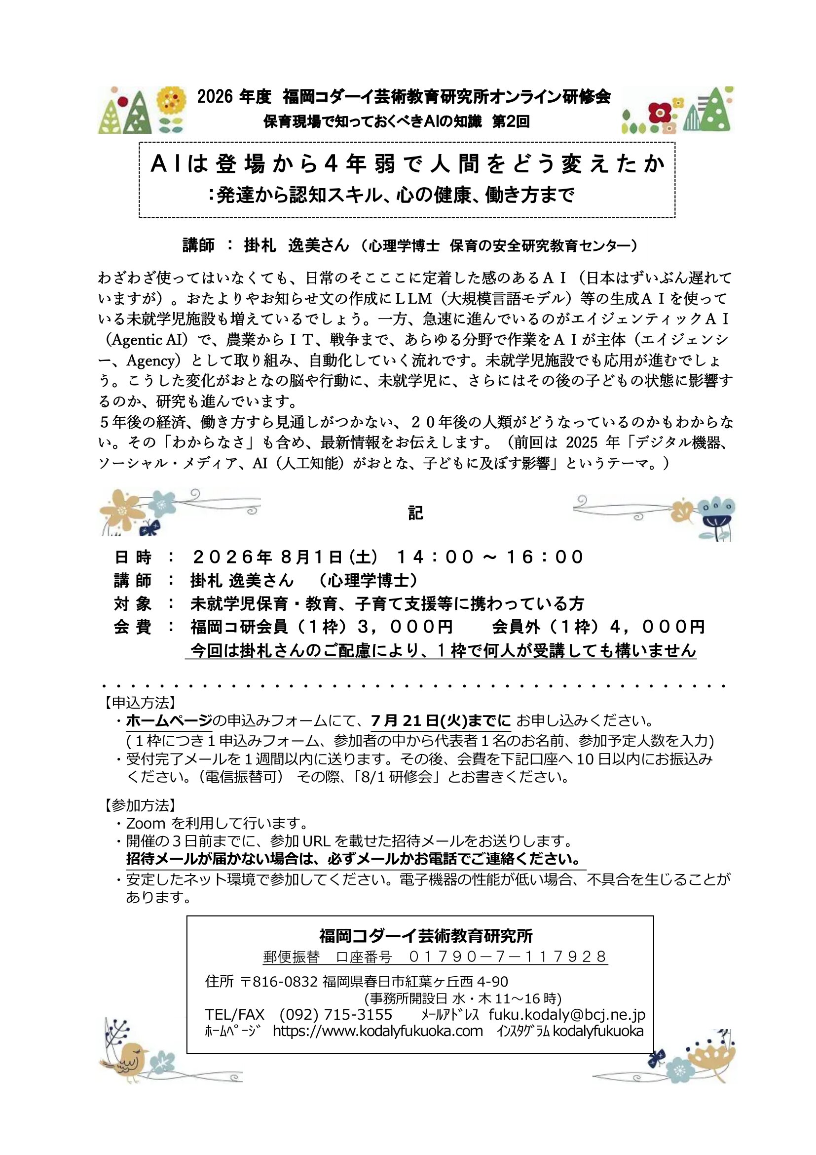 ※ 通信欄に「掛札さんオンライン研修会「AIは登場から4年弱で人間をどう変えたか」」とお書きください(簡素化可)